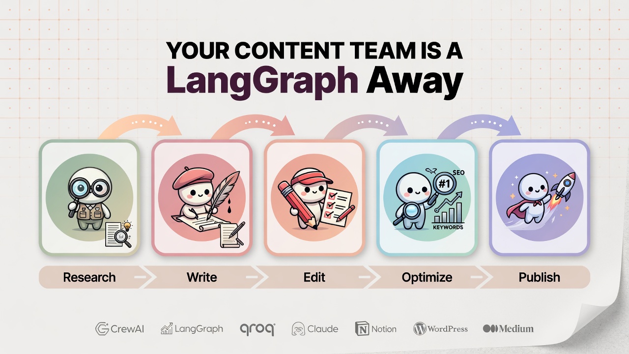 Scale content production from 1 article per month to 1 per day. This playbook includes a complete 5-agent system that handles every stage: research, writing, editing, SEO optimization, and publishing. Agents work together via CrewAI or LangGraph orchestration, with real system prompts proven in production. Deploy on Docker, set a daily cron job, and watch your content machine run automatically while you focus on strategy.